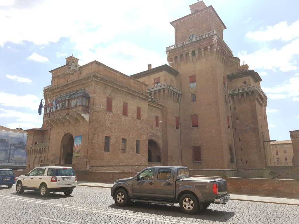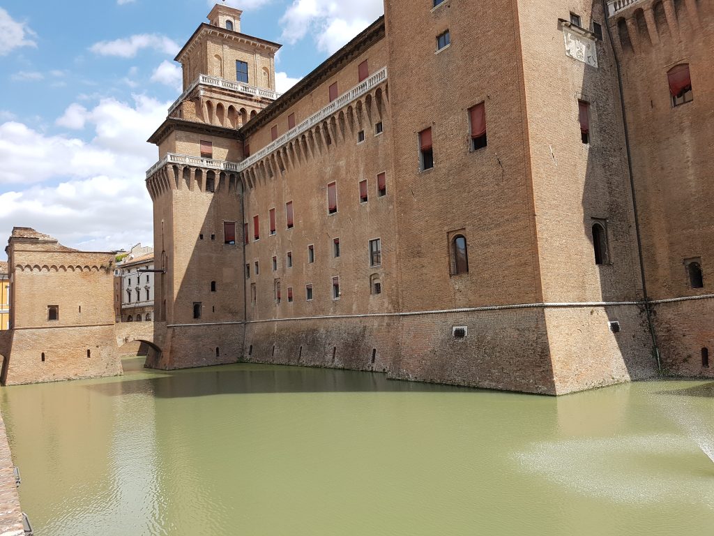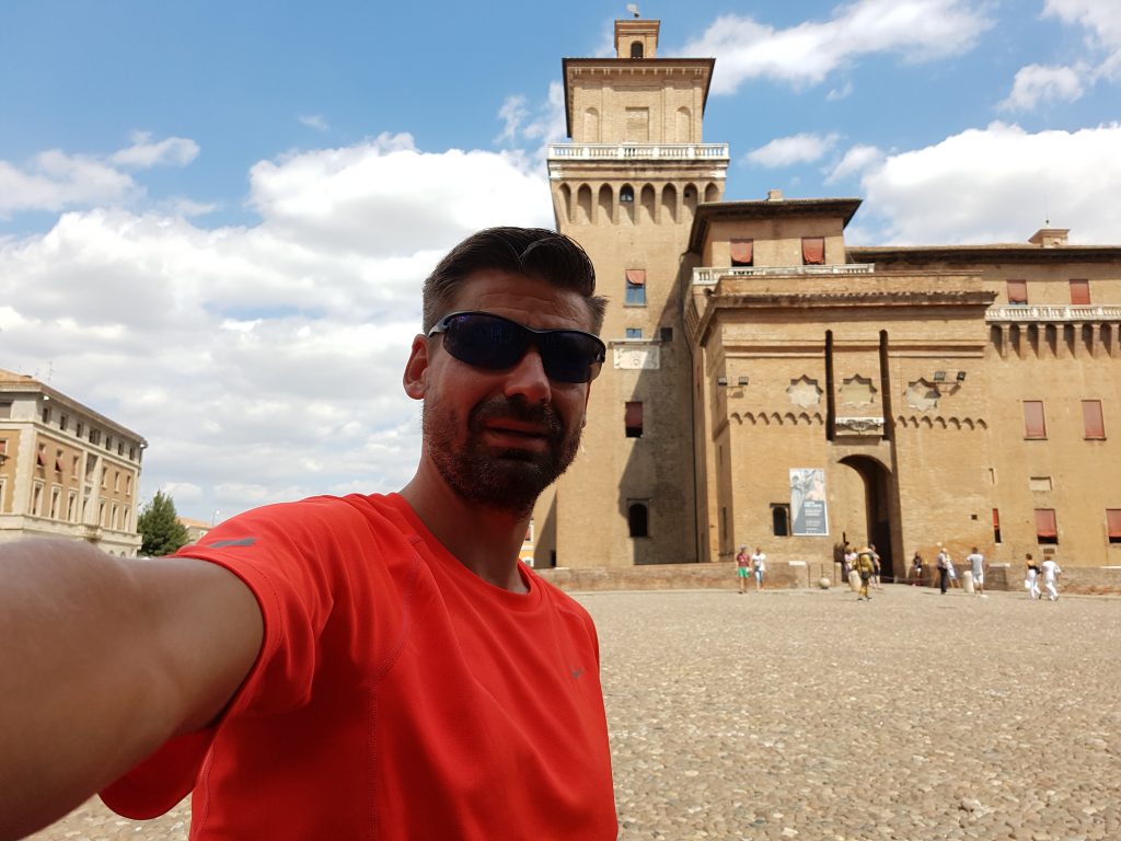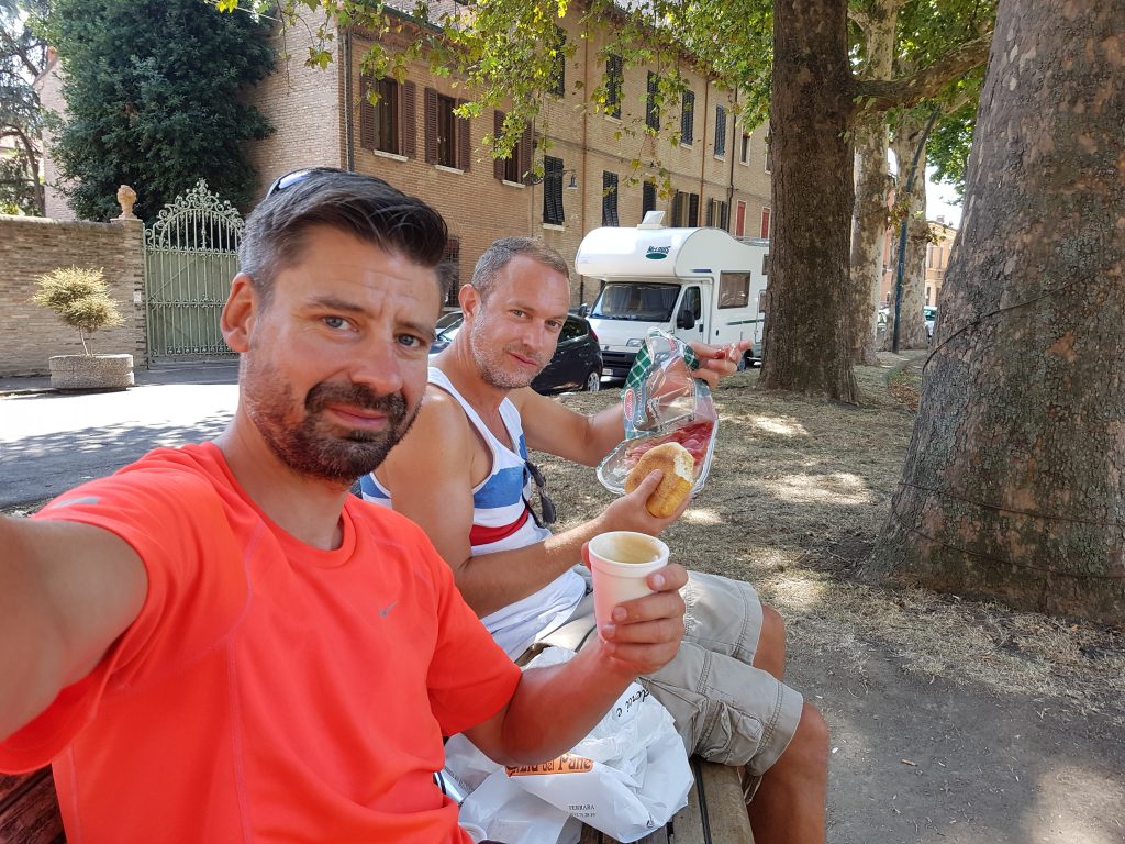 Im Italien ist es eigentlich egal, wo man unterkommt, in jeder Stadt strotzt es vor Geschichte, alten Gebäuden und historischen Plätzen. So auch in Ferrara, das zumindest ich vorher nicht kannte. Wir haben dem Tag nach der Nacht auf einem großen städtischen Campingplatz wirklich gemütlich begonnen und nach dem Abbau der Zelte erst einmal in Ruhe am einem schönen Platz in der Stadt gefrühstückt. Die inzwischen üblichen riesigen Mengen natürlich. Danach ging es dann wieder auf die Piste, bei schönstem Wetter. Überhaupt hat ins die ganze Zeit bis auf einem Tag die Sonne begleitet, irgendwas müssen wir richtig gemacht haben im Leben.