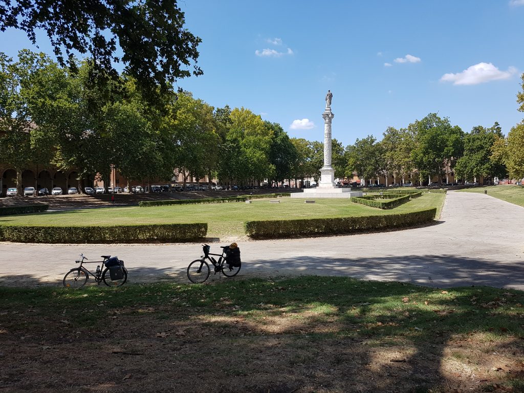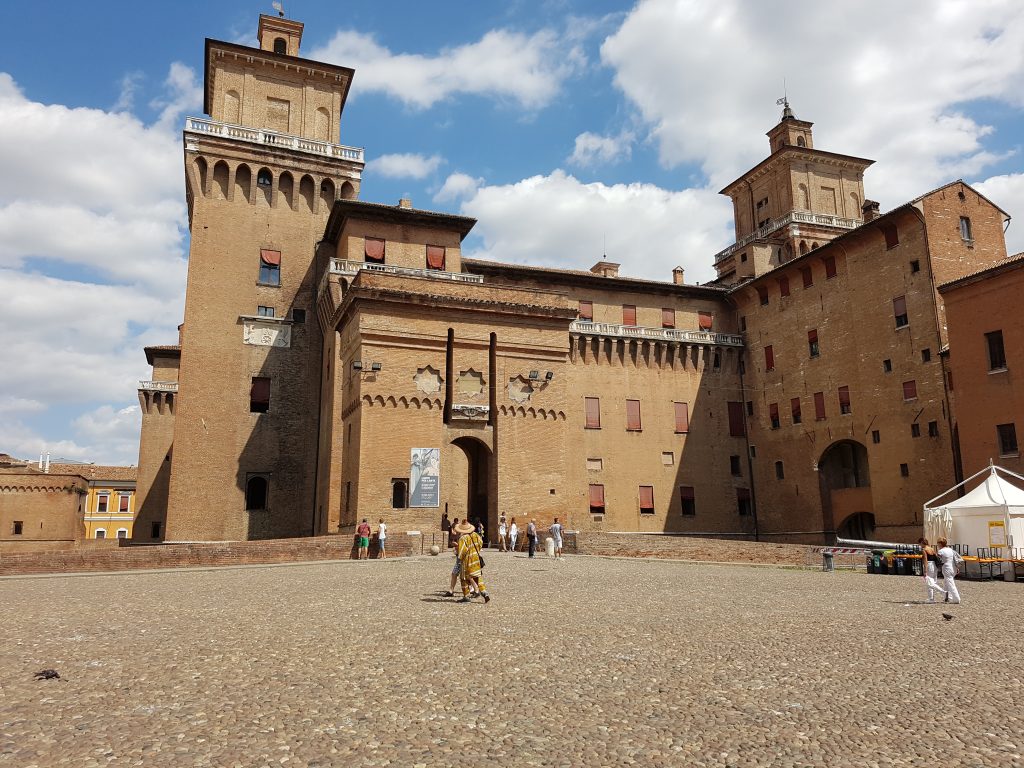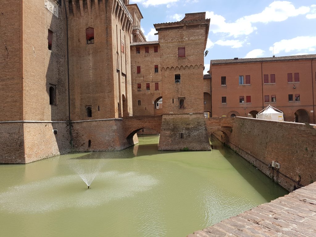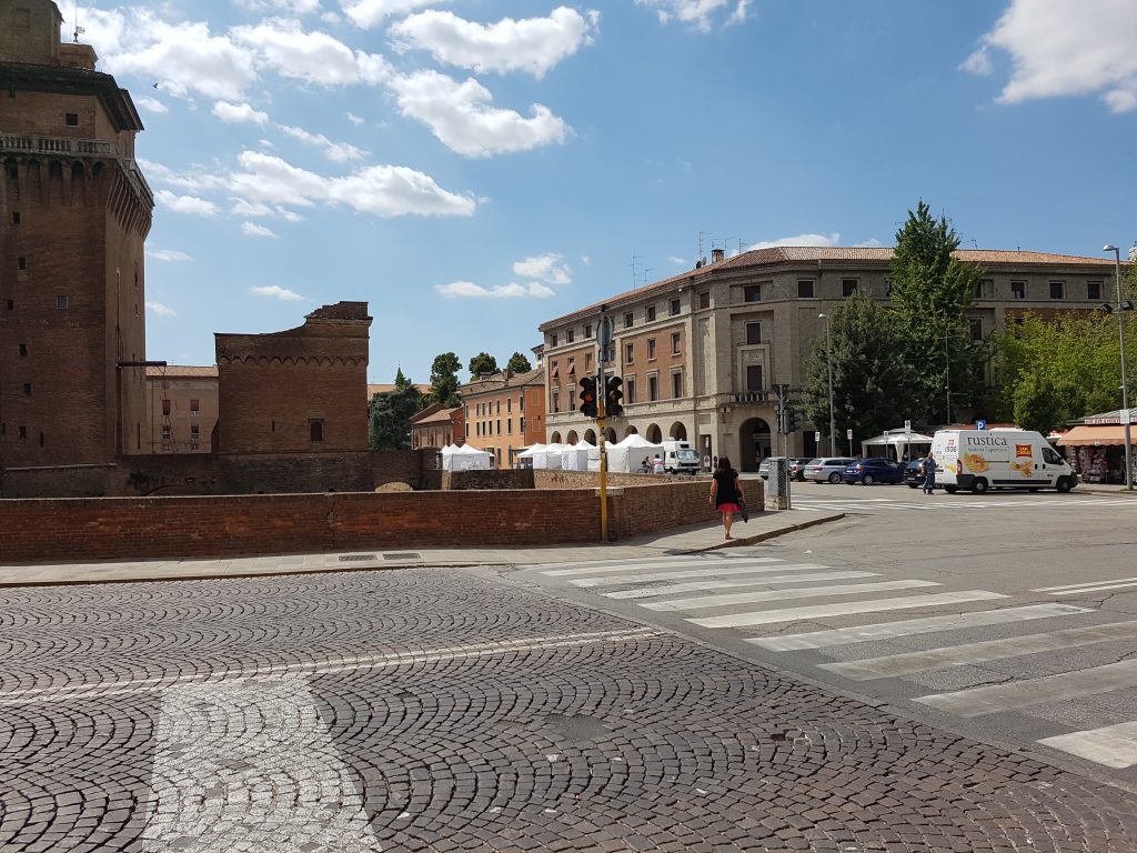 Im Italien ist es eigentlich egal, wo man unterkommt, in jeder Stadt strotzt es vor Geschichte, alten Gebäuden und historischen Plätzen. So auch in Ferrara, das zumindest ich vorher nicht kannte. Wir haben dem Tag nach der Nacht auf einem großen städtischen Campingplatz wirklich gemütlich begonnen und nach dem Abbau der Zelte erst einmal in Ruhe am einem schönen Platz in der Stadt gefrühstückt. Die inzwischen üblichen riesigen Mengen natürlich. Danach ging es dann wieder auf die Piste, bei schönstem Wetter. Überhaupt hat ins die ganze Zeit bis auf einem Tag die Sonne begleitet, irgendwas müssen wir richtig gemacht haben im Leben.