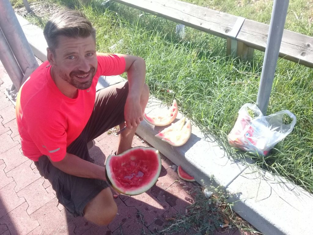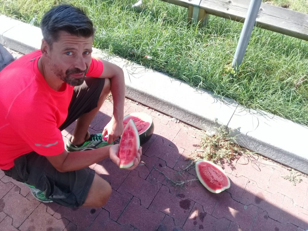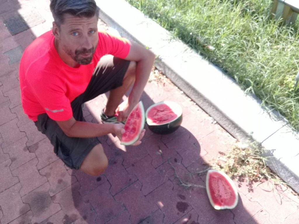Nach zig Kilometern stand mal wieder eine gepflegte Mittagspause in einem Supermarkt an. Platsche hat sich in Milchschnitten verliebt, diesmal hat er 7 verspeist. Die hätten aber auch 40% Milch, sagt er. Ich konnte einfach nicht an einer Wassermelone vorbei, ich dachte, da hätte ich beides, genug Wasser und essen. Ausserdem habe ich noch nie eine ganze Wassermelone gegessen, muss man alles ja mal gemacht haben. Eine Wassermelone später war ich mir nicht mehr sicher, ob das eine gute Idee war. Der Bauch spannt schon arg. 10 Kilometer später wusste ich, dass es bessere Ideen gibt – ich musste alle paar Minuten die Fahrt unterbrechen, um Wasser zu lassen.